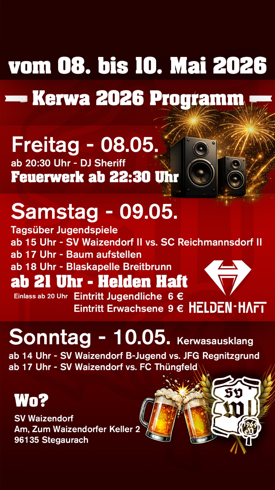Samstag: Tagsüber Jugendspiele • 15:00 SV Waizendorf II vs. SC Reichmannsdorf II • 17:00 Aufstellen des Kirchweihbaumes • 18:00 BLASKAPELLE BREITBRUNN • 21:00 Großer Party-Abend mit HELDEN HAFT •